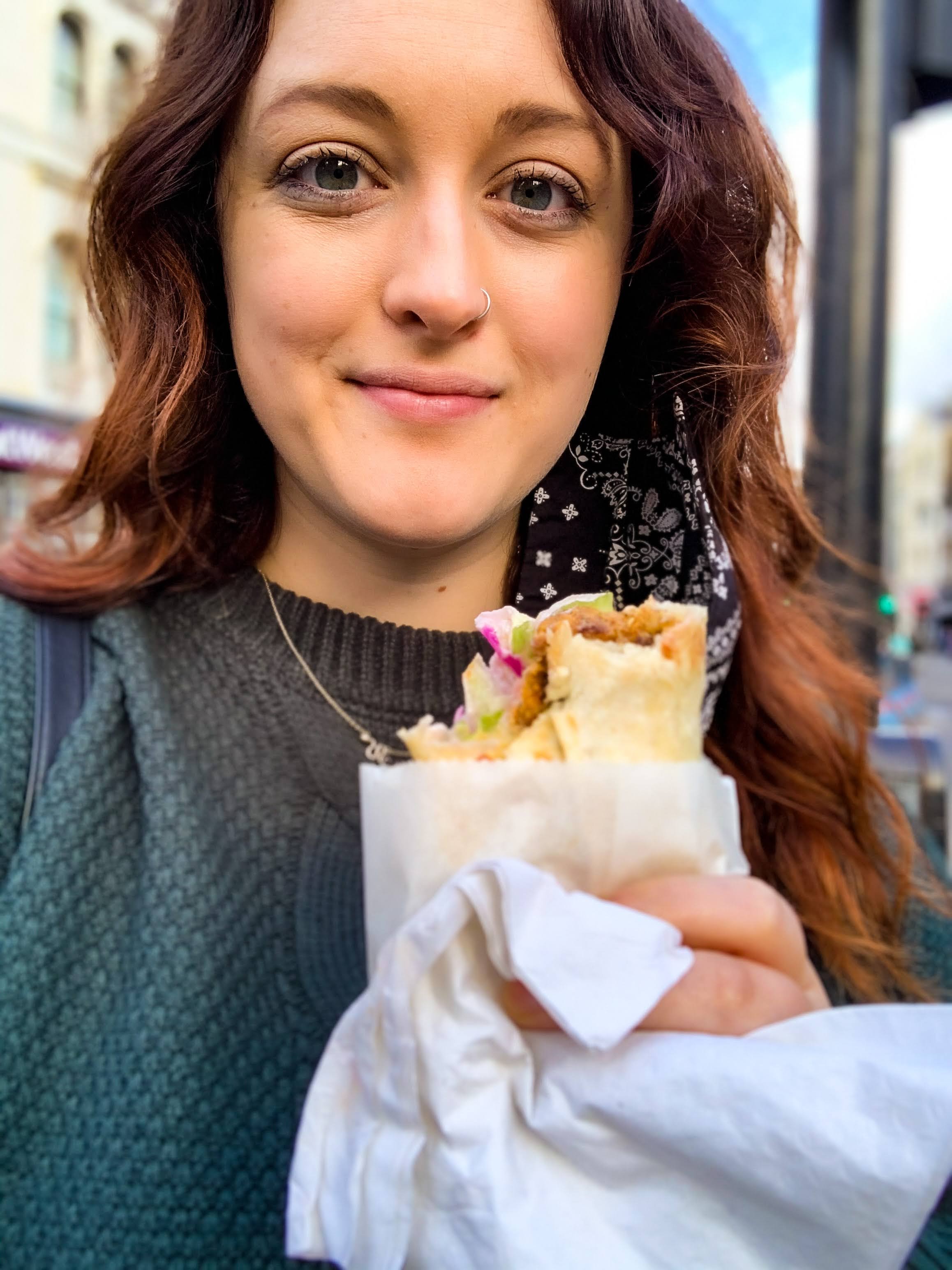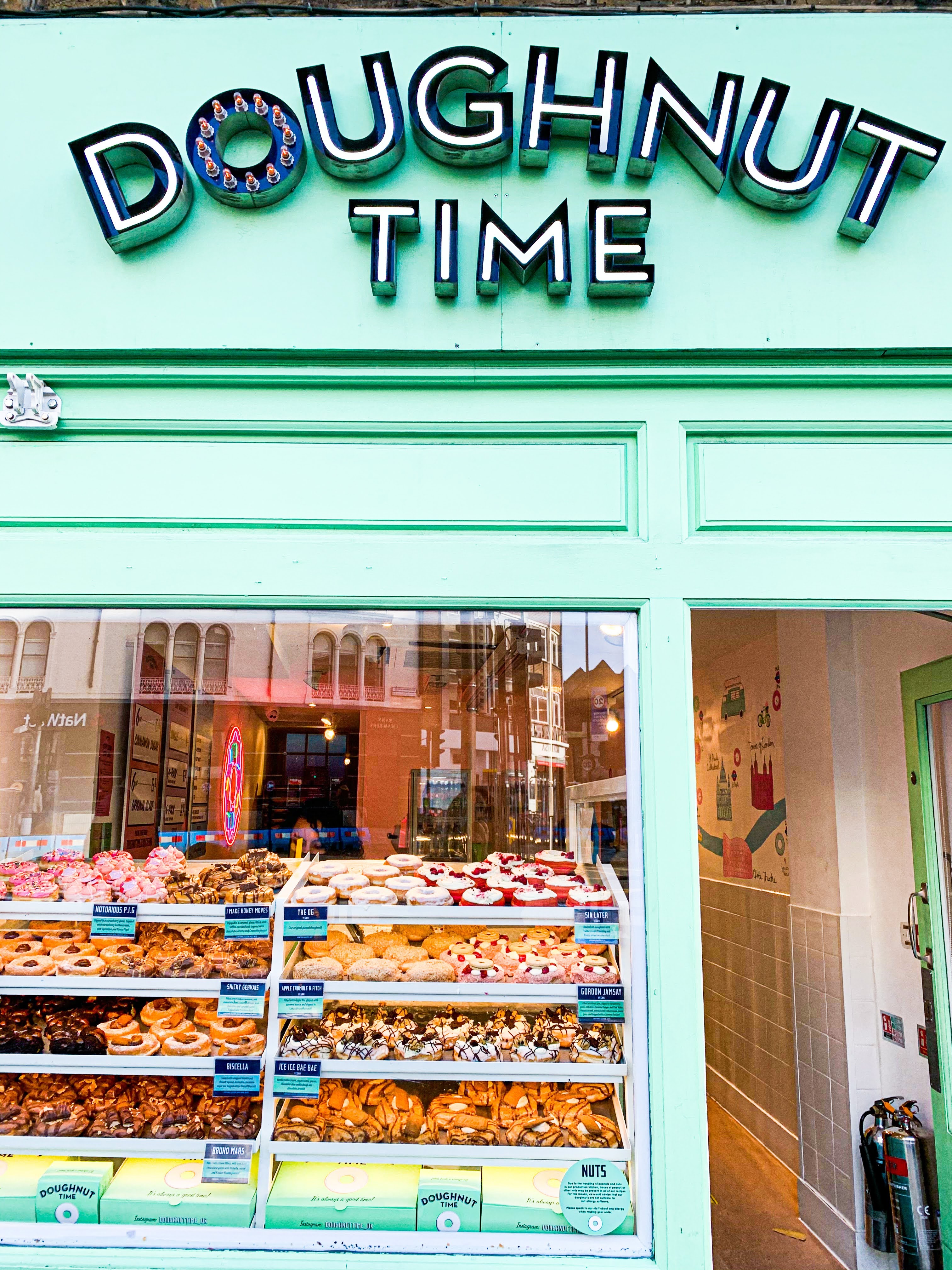 Our fourth and final stop of the day was to Borough Market, this was my first time here, but my husband’s second time. It’s a huge open air market back off the city street next to some exceptional architecture. This place is a perfect location to try all types of ethnic foods, shop for fresh vegetables, seafood, meats, cheeses, wines, and anything else you could think of. I’m sure this place is normally packed!! How could it not be with all the great options available. I would say this was the busiest location we visited, and still everyone was distanced, wearing masks, and we weren’t allowed to eat inside the market, understandably. We decided to get lunch at the market. It was my husbands turn to choose, so we went to a place called Hogs, that served greek wraps, falafels, and bbq wraps. I went with the falafel, it’s one of my favorite foods, and it was incredible! On our way home we wandered past the cutest doughnut shop, I decided to splurge some more that day, and buy some to take home for us to enjoy later from the comfort of our cozy window nook.